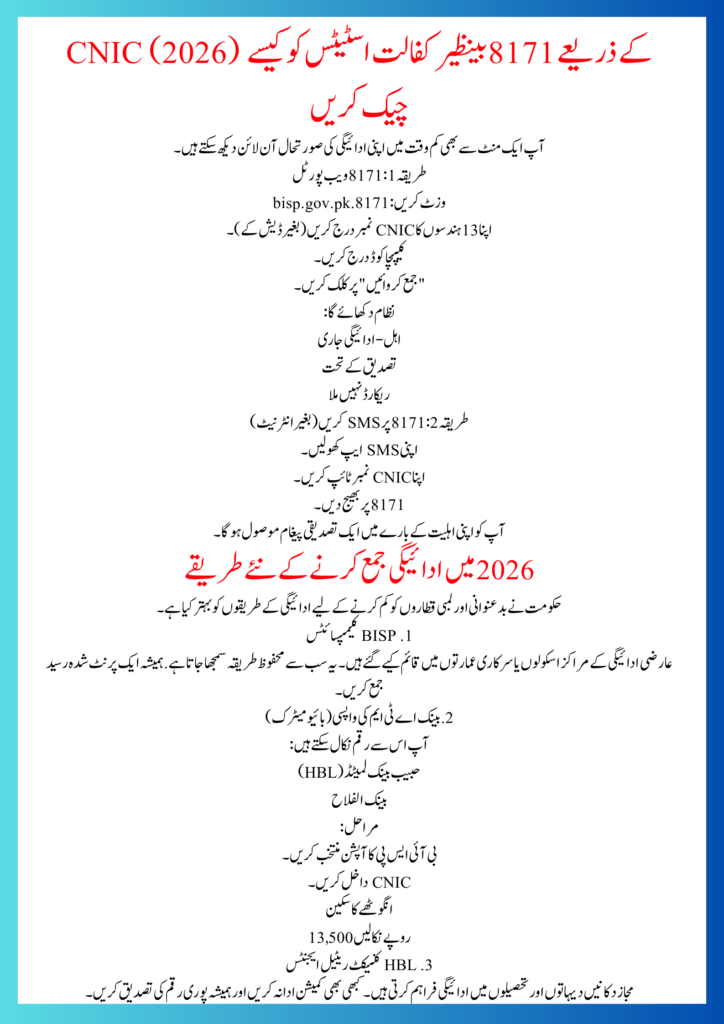 The Benazir Kafalat 13500 Phase 2 Payment 2026 is a lifeline for millions of Pakistani families struggling with inflation. With improved biometric systems, digital CNIC checking through 8171, and multiple withdrawal options, the process has become more transparent and secure.