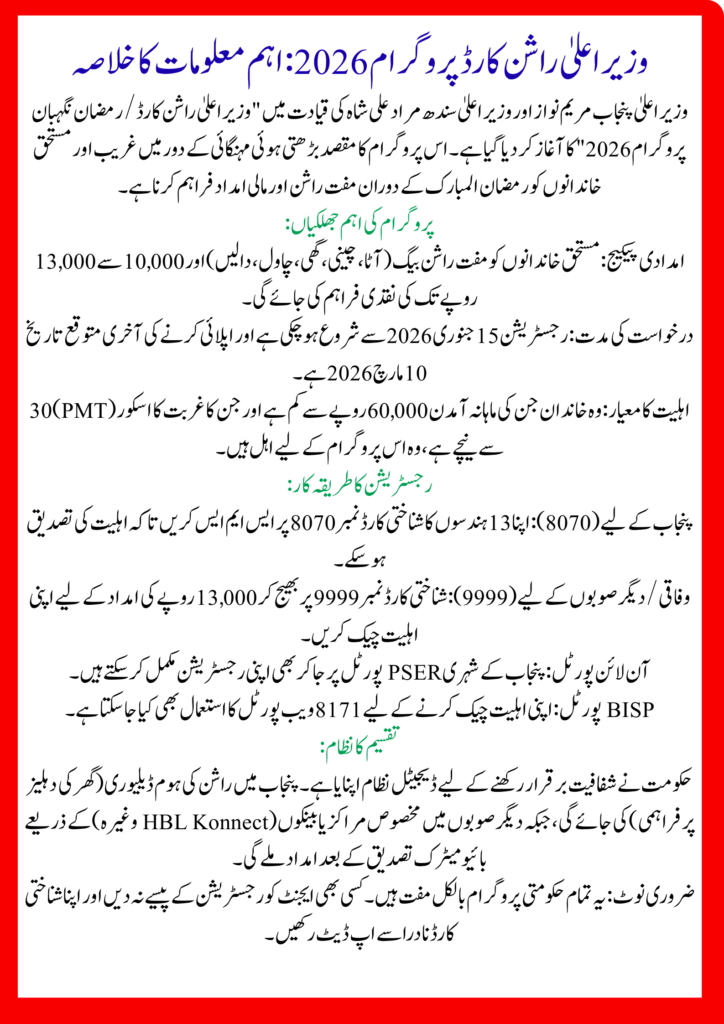 The CM Rashan Card Distribution Schedule 2026 is a major relief initiative for millions of Pakistani families. With online registration, SMS verification, and biometric systems, the government aims to ensure transparency and dignity.