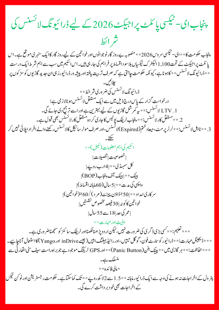 The Driving License Requirements for Punjab E-Taxi Pilot Project 2026 is strict but fair. You must have a valid LTV or car driving license. Learner permits and expired licenses are not accepted. This ensures safety, professionalism, and smooth operation of the electric taxi service.